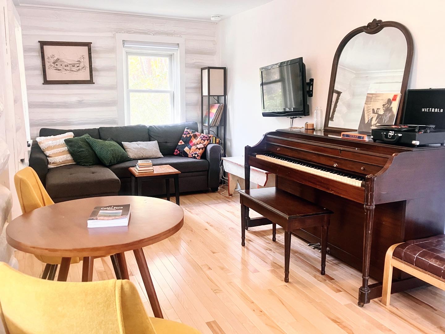 - Large living room with 1 sleeper sofa (full bed), piano, TV with Roku, wood burning stove